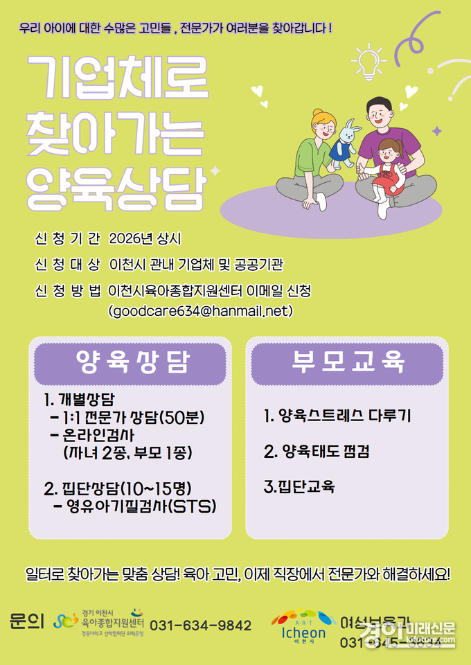 이천시 육아종합지원센터 관계자는 “아이를 키우는 부모라면 누구나 고민이 있지만, 직장 생활로 인해 상담의 기회를 놓치는 경우가 많다”라며 “직접 찾아가는 서비스를 통해 부모의 양육 부담을 덜고 건강한 양육 환경을 조성하는 데 최선을 다하겠다”라고 전했다.