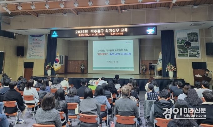 (경인미래신문=민경호 기자) 인천 미추홀구(구청장 이영훈)는 지난 27일 구청 대회의실에서 회계담당자 및 공사감독관 등 100여 명을 대상으로 ‘계약 분야 주요 감사 지적 사례 교육’을 실시했다고 밝혔다.