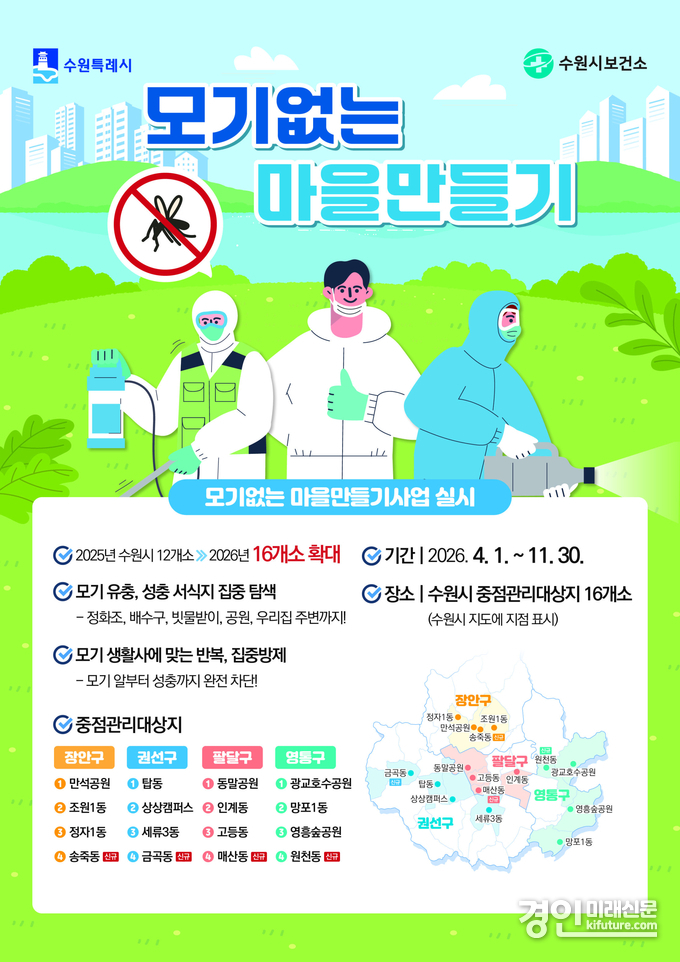 (경인미래신문=민경호 기자) 수원시보건소가 올해 ‘모기 없는 마을만들기’ 사업 대상지를 16개소로 확대 운영한다.