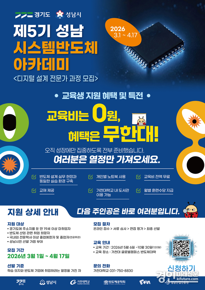 (경인미래신문=민경호 기자) 성남시(시장 신상진)는 반도체 설계 분야 실무형 인재를 육성하기 위한 ‘성남시 시스템반도체 아카데미’ 교육생을 모집한다고 밝혔다.