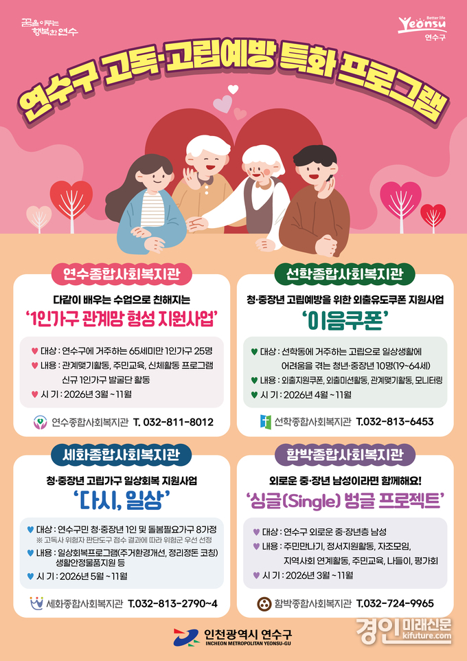 (경인미래신문=민경호 기자) 인천 연수구(구청장 이재호)가 사회적 고립 가구의 일상을 살피고 지역사회 복귀를 돕기 위해 지역 내 종합사회복지관 4곳과 함께 ‘2026년 고독·고립 예방 특화사업’을 본격적으로 추진한다.