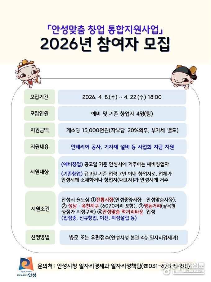 (경인미래신문=민경호 기자) 안성시는 오는 8일부터 22일까지 ‘2026년 안성맞춤 창업 통합지원사업’ 참여자를 모집한다.