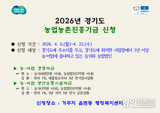 (경인미래신문=민경호 기자) 이천시(시장 김경희)는 농업인에게 장기·저리 융자 지원을 실시하고 경영안정을 돕기 위해 2026년 2차 경기도 농업농촌진흥기금 농어업 경영자금, 농어업 생산유통시설자금 사업에 대한 신청을 6일부터 접수한다.