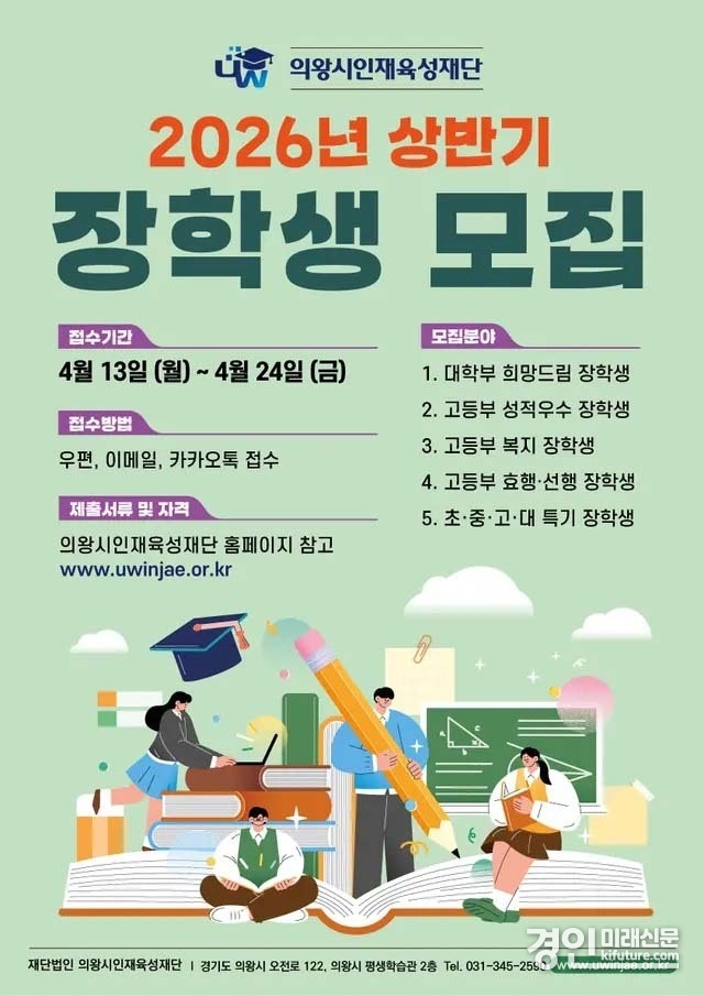 (경인미래신문=민경호 기자) 의왕시인재육성재단(이사장 김성제)이 2026년 상반기 장학생을 모집한다.