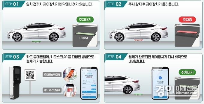 차량을 주차하면 바닥에서 차단 장치인 플랩이 자동으로 올라오고 출차 시 무인정산기나 스마트폰 앱으로 요금을 결제하면 장치가 내려가는 방식이다.