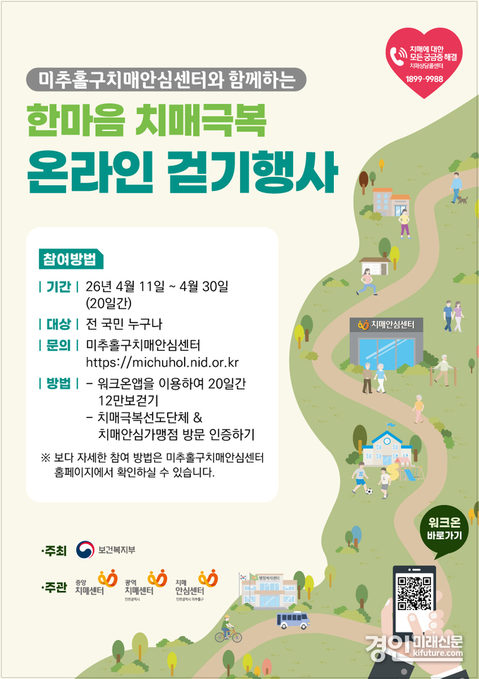 (경인미래신문=민경호 기자) 인천 미추홀구보건소(소장 차남희, 이하 보건소)가 걷기 좋은 봄철을 맞아 오는 11일부터 30일까지 치매 예방을 위한 ‘2026 한마음 치매 극복 온라인 걷기 행사’를 개최한다.