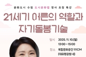 (경인미래신문=민경호 기자) 수원문화재단(대표이사 오영균)이 오는 10일 오후 1시 복합문화공간 111CM에서 심리학 전문가 이호선 교수를 초청해 시민 대상 인문심리 특강 '21세기 어른의 역할과 자기돌봄 기술'을 개최한다. 이번 강연은 문화도시 조성사업 중 ‘도시문화랩’의 일환으로 마련됐다. ‘도시문화랩’은 외로움, 고립 등 현대 도시의 사회적 문제를 문화적으로 완화하기 위한 프로젝트로, ‘서로를 살피고 문제에 맞서는 문화도시 수원’이라는 비전을 바탕으로 건강한 도시문화 형성을 위해 다양한 프로그램을 운영하는 사업이다. 11월 특강에서는 세대 간 이해, 올바른 상호 소통법, 마음건강 관리법 등을 다룰 예정이다. 이호선 교수는 숭실사이버대학교 교수이자 한국노인상담센터 센터장으로, JTBC '이혼숙려캠프', tvN '어쩌다 어른' 등 다수의 방송을 통해 대인관계와 심리 건강의 중요성을 알리며 대중적 신뢰를 쌓아온 심리학자다. 이번 강연에서는 급변하는 세대를 살아가는 어른으로서의 역할과 책임 그리고 스스로를 돌보며 건강하게 관계를 이어가는 방법을 심리학적으로 풀어낸다. 수원문화재단 관계자는 “이번 도시문화랩 명사초청 특강은 도시의 외로움을 완화하고 세대 간 관계