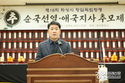 (경인미래신문=민경호 기자) 화성특례시의회(의장 배정수)는 18일 화성시 보훈회관 3층 대강당에서 열린 ‘제18회 순국선열·애국지사 추모제’에서 선열들의 고귀한 넋을 기렸다. 이날 추모제에는 배정수 의장을 비롯해 광복회 화성시지회 회원 및 보훈 가족 등 약 70명이 함께했으며 초헌례·아헌례·종헌례 등 전통 의식 절차에 따라 엄숙하게 진행됐다. 광복회 화성시지회가 주관한 이번 추모제는 독립을 위해 희생한 순국선열과 애국지사의 숭고한 정신을 계승하고자 마련된 자리로 특히, 화성 지역 전역에서 일어났던 1919년 3·1운동의 역사적 의미를 되새기는 뜻깊은 시간이 됐다. 화성은 동탄면·송산면·서신면·향남면 등에서 만세운동과 횃불 시위가 연이어 발생하며 항일 독립운동의 중심지 역할을 했고 제암리 학살 사건은 세계사에 기록될 만큼 한국 독립운동사의 비극적이면서도 상징적인 사건으로 꼽힌다. 배정수 의장은 추모사에서 “선열들의 희생과 헌신이 있었기에 오늘의 자유와 번영을 누릴 수 있다”며 “독립 유공자와 유족에 대한 예우를 강화하고 선열들이 바랐던 정의롭고 품격 있는 도시를 만들어가는 데 최선을 다하겠다”고 전했다. 한편 광복회 화성시지회는 독립 유공자 후손인 윤대성 지회